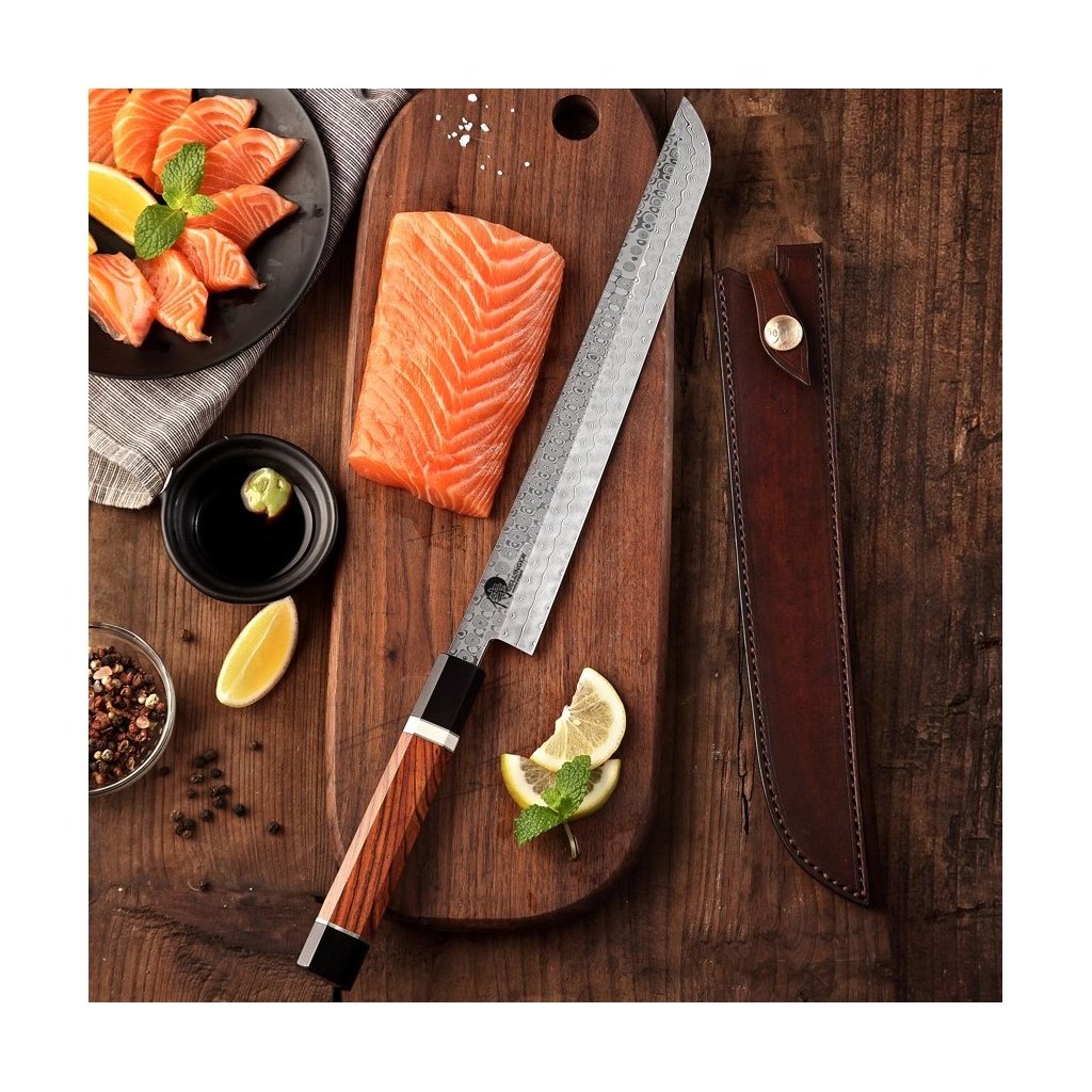 Väga terav Jaapani nuga Sakimaru/Yanagiba Dellinger Octagonal Full Damascus (tera pikkus 270 mm), mis on valmistatud damaskuseterasest, millel on muljetavaldav disain ja kõrgeim kvaliteet. See on pikk, ainult ühelt küljelt lihvitud nuga, mis on mõeldud kala õhukeste viilude lõikamiseks sushi ja sashimi jaoks. Selle noaga saate hõlpsasti lõigata mitte ainult suuri lihatükke (praad), vaid ka õhukesi köögiviljaviilusid. Selle ilus ja elegantne õhuke tera suudab lõigata koostisosi pikkade katkematute lõikude kaupa, säilitades seega nende terviklikkuse ja värskuse. Yanagiba on üks tähtsamaid traditsioonilisi Jaapani noad ja kuulub paljude kokkade repertuaari. Selle kauni ja funktsionaalse noaga muutuvad isegi kõige lihtsamad ülesanded erakordseks elamuseks. Jaapani käsitöö, täpsus ja uued tehnoloogiad muudavad selle damastterasest noa ainulaadseks ja jäljendamatuks.