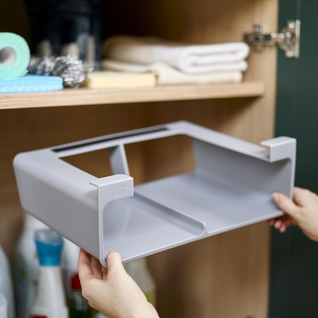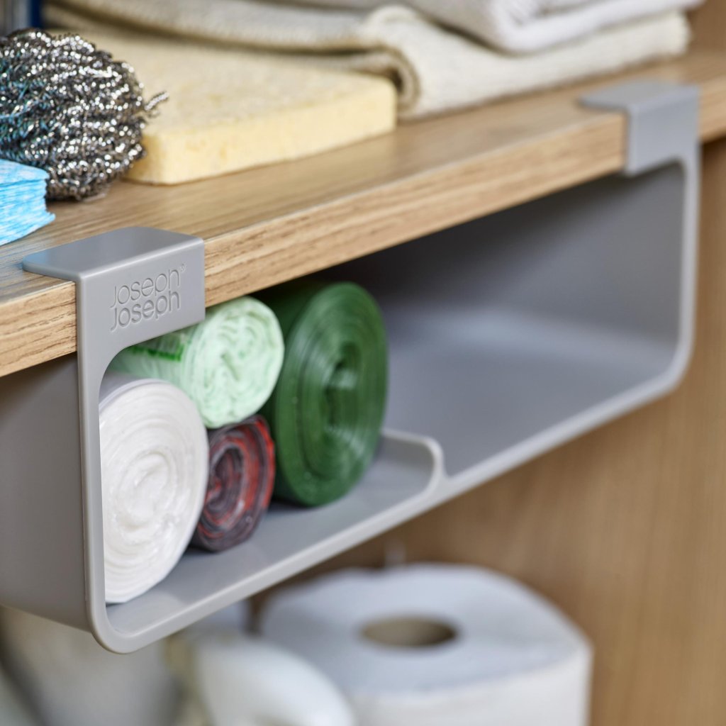 - Korraldaja Joseph Joseph CUPBOARDSTORE võimaldab kasutada köögikapi riiuli all olevat vaba ruumi ja loob praktilise koha köögikilede, fooliumi või kottide hoiustamiseks.