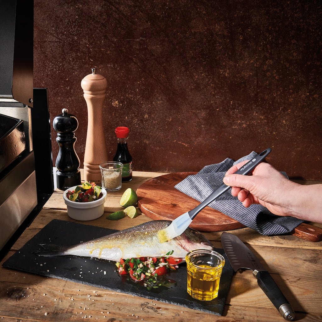 - Silikoonpintsel de Buyer on praktiline abiline magusate ja soolaste roogade valmistamisel muna, või või glasuuriga pintseldamiseks.