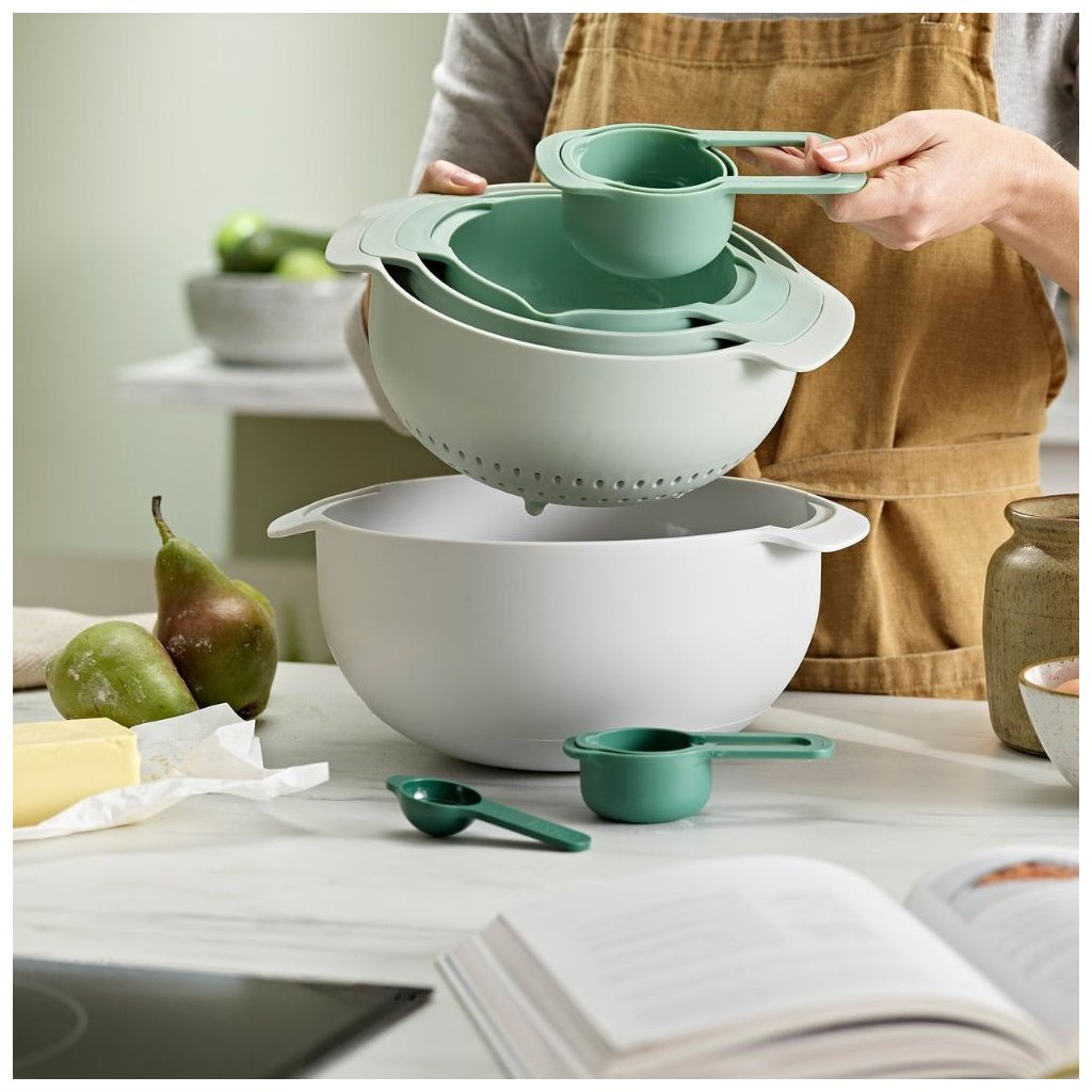 Kausid NEST 40112, 9-osaline komplekt, koos sõela ja mõõtetopsidega, hall/roheline, Joseph Joseph