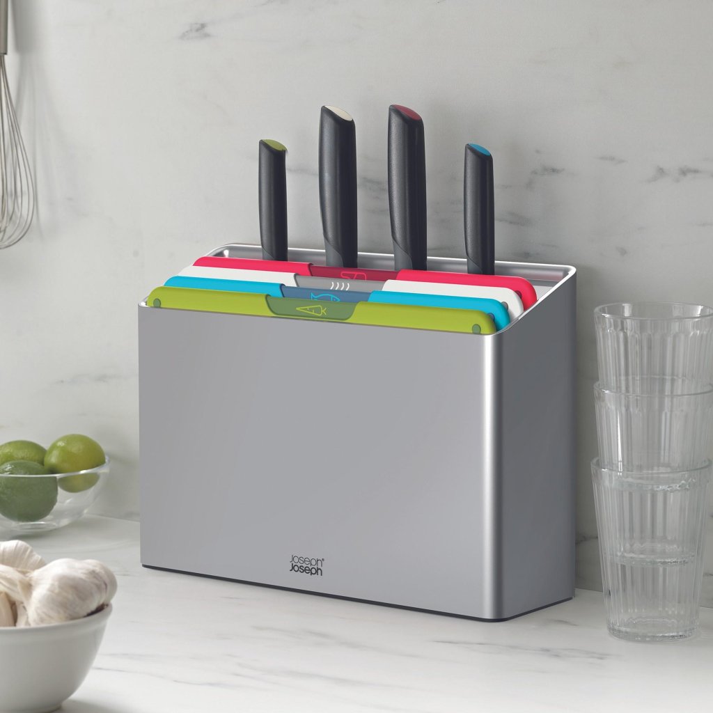 - Joseph Joseph FOLIO ICON PLUS komplekt ühendab 4 lõikelauda ja 4 kööginuga kompaktses aluses, nii et kõik vajalik toidu valmistamiseks on ühes kohas korralikult hoiul.