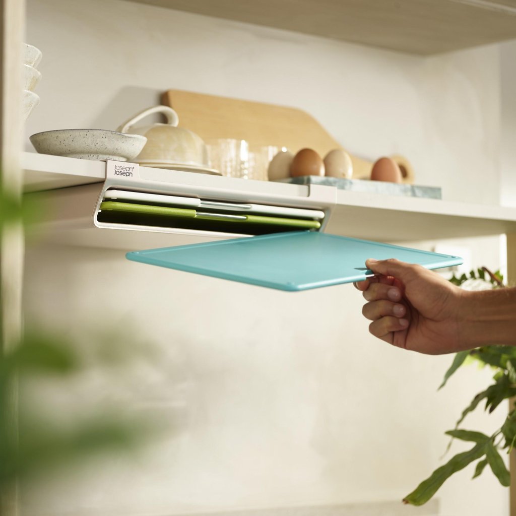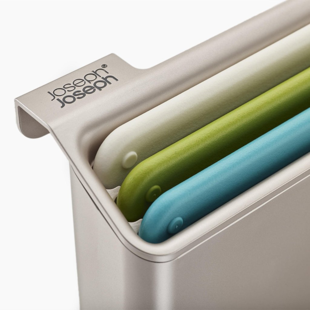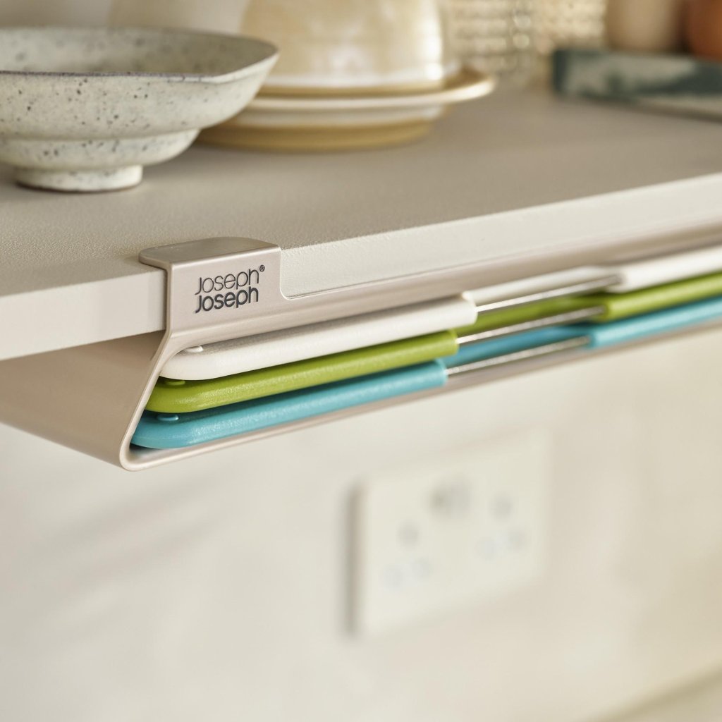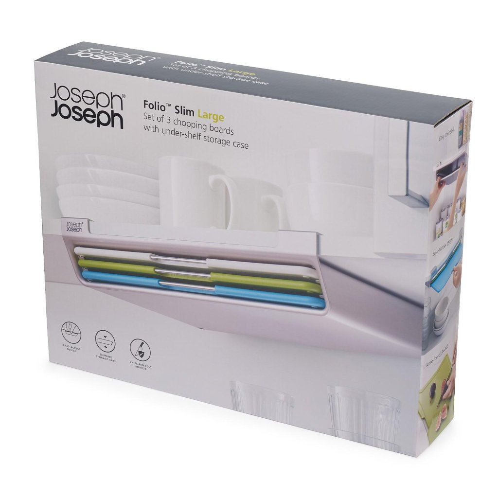 - Joseph Joseph FOLIO SLIM lõikelaudade komplekt pakub praktilist lahendust toiduainete valmistamiseks ja võimaldab samal ajal hoiustada lõikelaudu köögikapi riiuli all, nii et tööpind jääb vabaks.