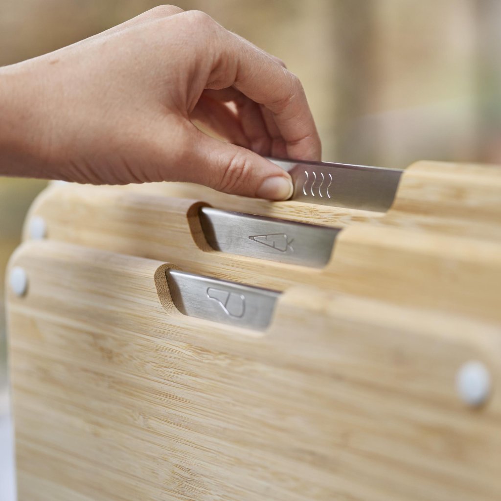 - Joseph Joseph NEST lõikelaua komplekt sisaldab 3 bambuslauast lõikelauda, mis on paigutatud kompaktsele metallist alusele, mis hoiab tööpinna toiduvalmistamise ajal korras.