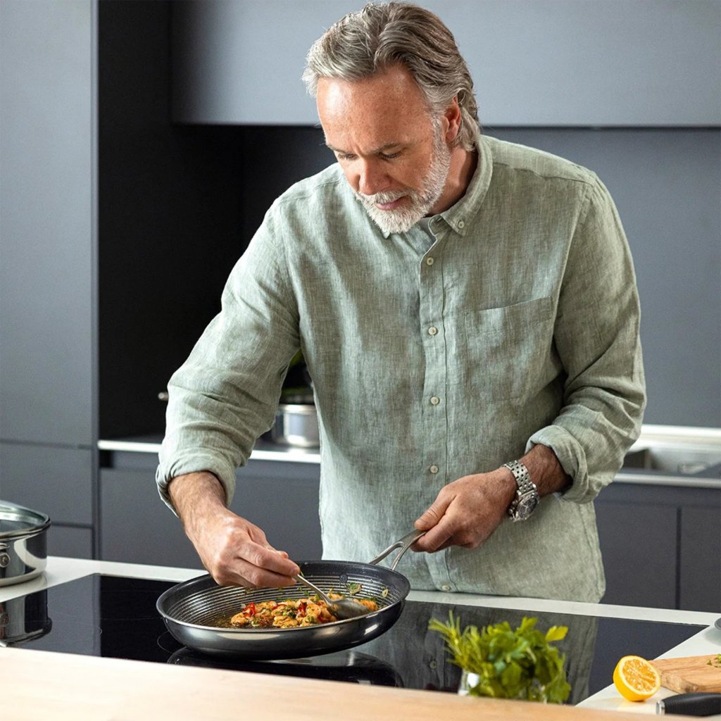 - hübriidne mittekleepuv pind koos kõrgendatud roostevabast terasest elementidega kaitseb mittekleepuvaid soone, nii et te ei pea muretsema kattekihi kriimustamise või koorumise pärast, kui kasutate metallnõusid