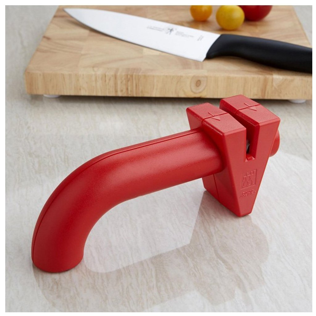Zwillingi teritaja Twin Sharp on praktiline ja väga lihtne kasutada. Ideaalne nugade algse teravuse taastamiseks. Asetage lihvija tasasele tööpinnale, võtke kinni kumerast plastmassist osast ja ajage tera 4-5 korda mööda lihvija V-kujulise ava pikkust. Tera pikkus on 16,5 cm.