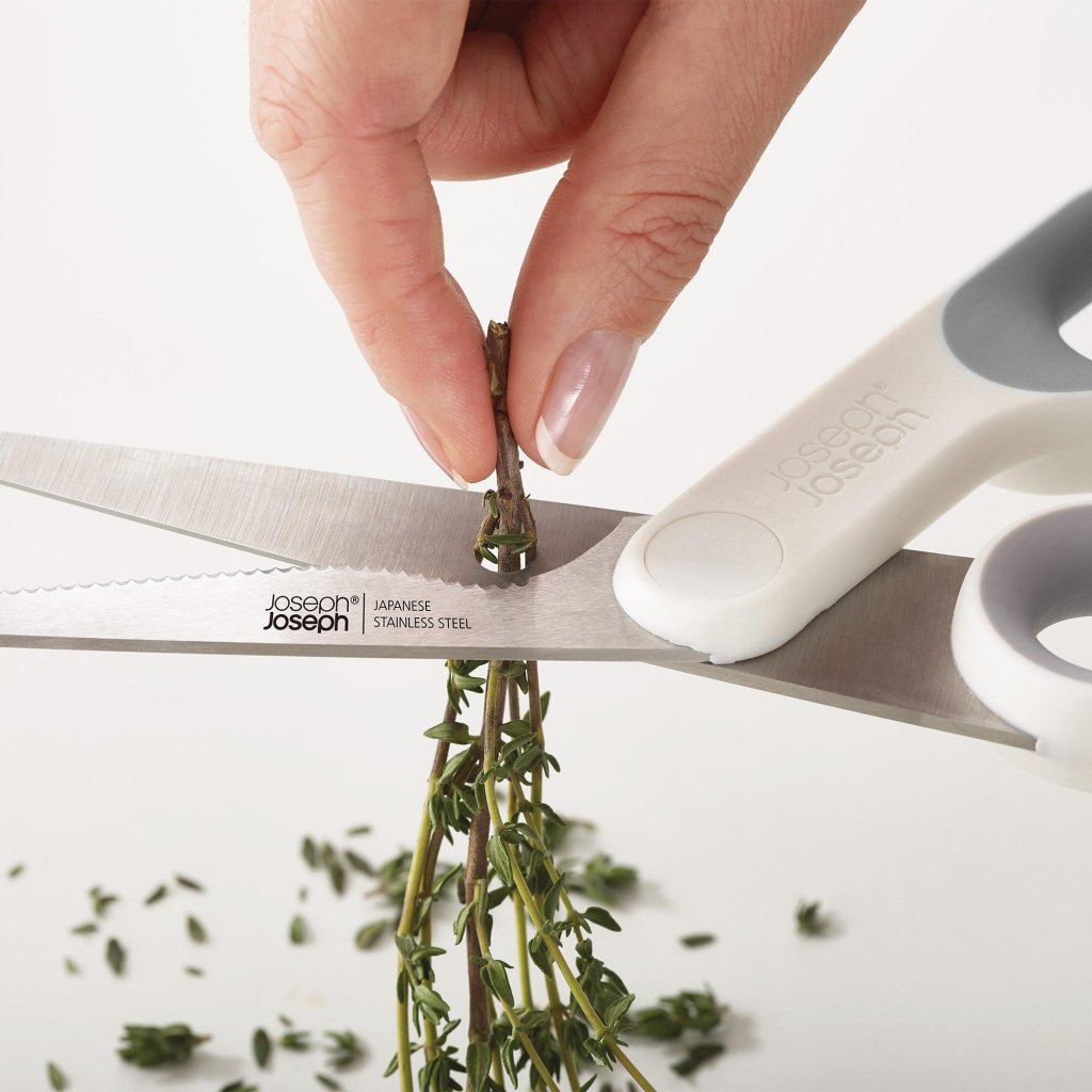 - Kääride tera praktiline sälk aitab turvaliselt haarata näiteks lillevarte või tugevamaid toiduaineid nende lõikamisel.