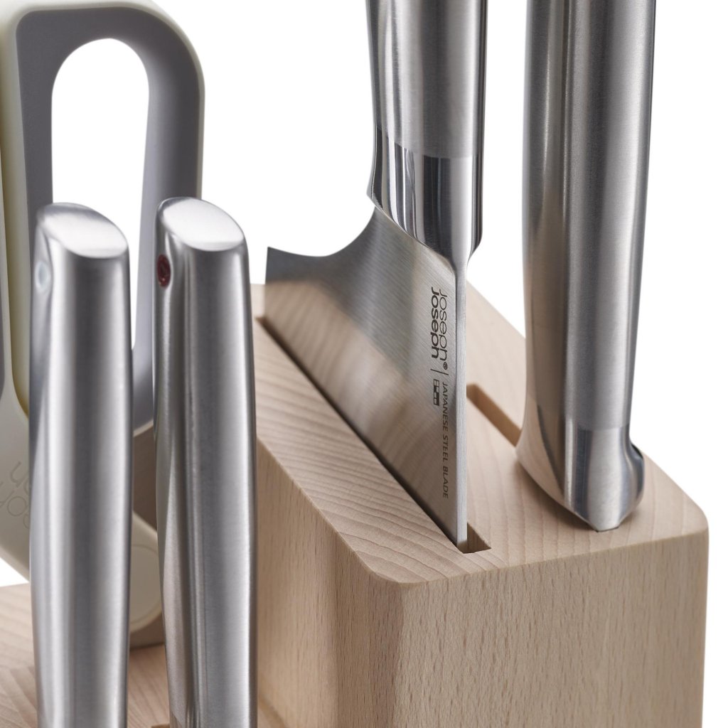 - Joseph Josephi kööginoa- ja käärisarja ELEVATE FUSION praktiline lahendus igapäevaseks koostisosade valmistamiseks ja elegantse pöögipuidust plokiga köögitarvikute korrashoiuks.