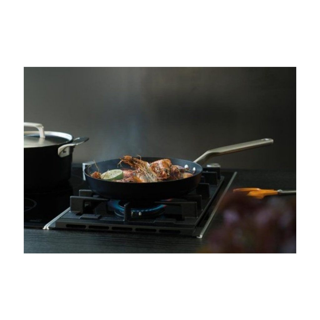 - valmistatud kergest alumiiniumist, mis jaotab kuumust väga hästi, nii et toit kuumutatakse ühtlaselt kogu pinnal