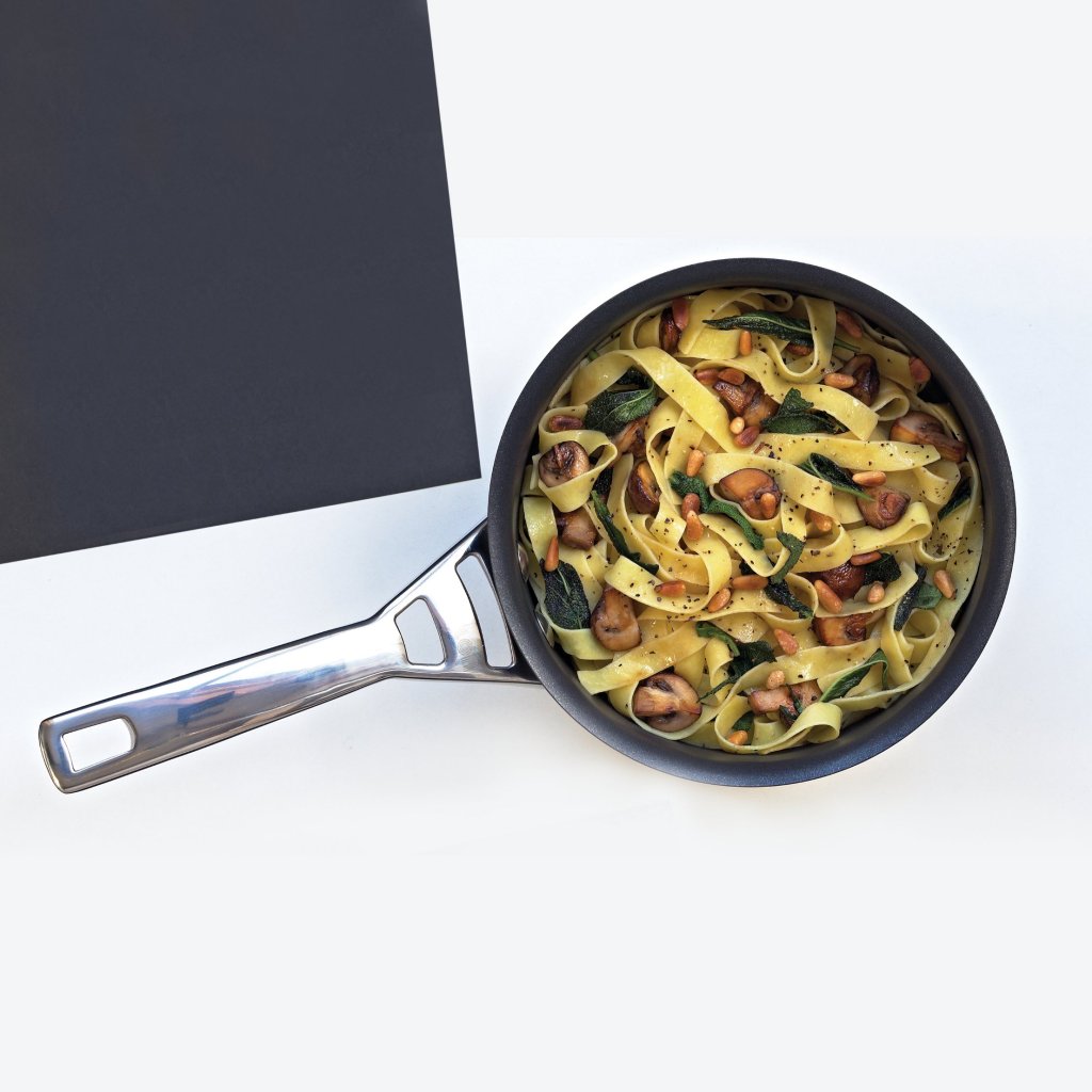 - alumiiniumsüdamikuga konstruktsioon koos eriti paksu teraspõhjaga jaotab kuumuse ühtlaselt kogu toidunõu pinnal, aidates vältida kõrvetamist ja tagada täpse küpsetamise kontrolli