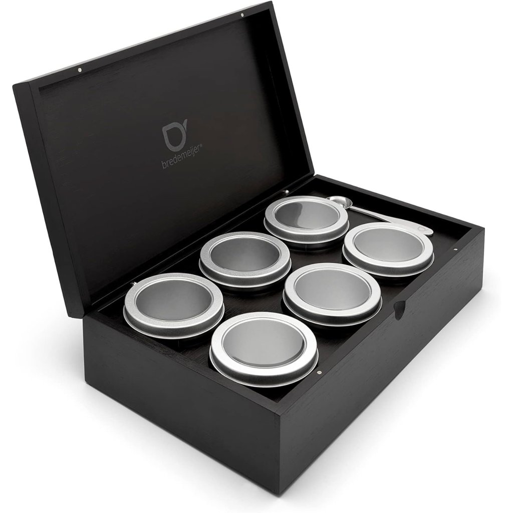 Purutee organiseerija 36 x 21 cm, 6 kanistri ja mõõtelusikaga, must, bambus, Bredemeijer