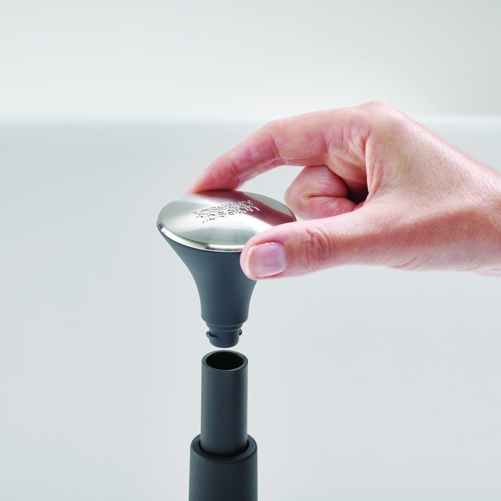 JOSEPH JOSEPH Push&Tear paberirullide stendil on vedruga pea, mida vajutades saate rulli rebenemise ajal rulli lukustada. Kui teil on määrdunud käed, võimaldab roostevabast terasest pea ka randme või küünarvarrega pigistada. Aluse aluse kõrgendatud serv takistab paberi iseseisvat lahti rullumist. Statiivi alumine külg on libisemisvastase pinnakattega. Uued rullid sisestatakse pärast pea eemaldamist. Statiiv sobib kuni 24 cm kõrguste paberirullide jaoks.