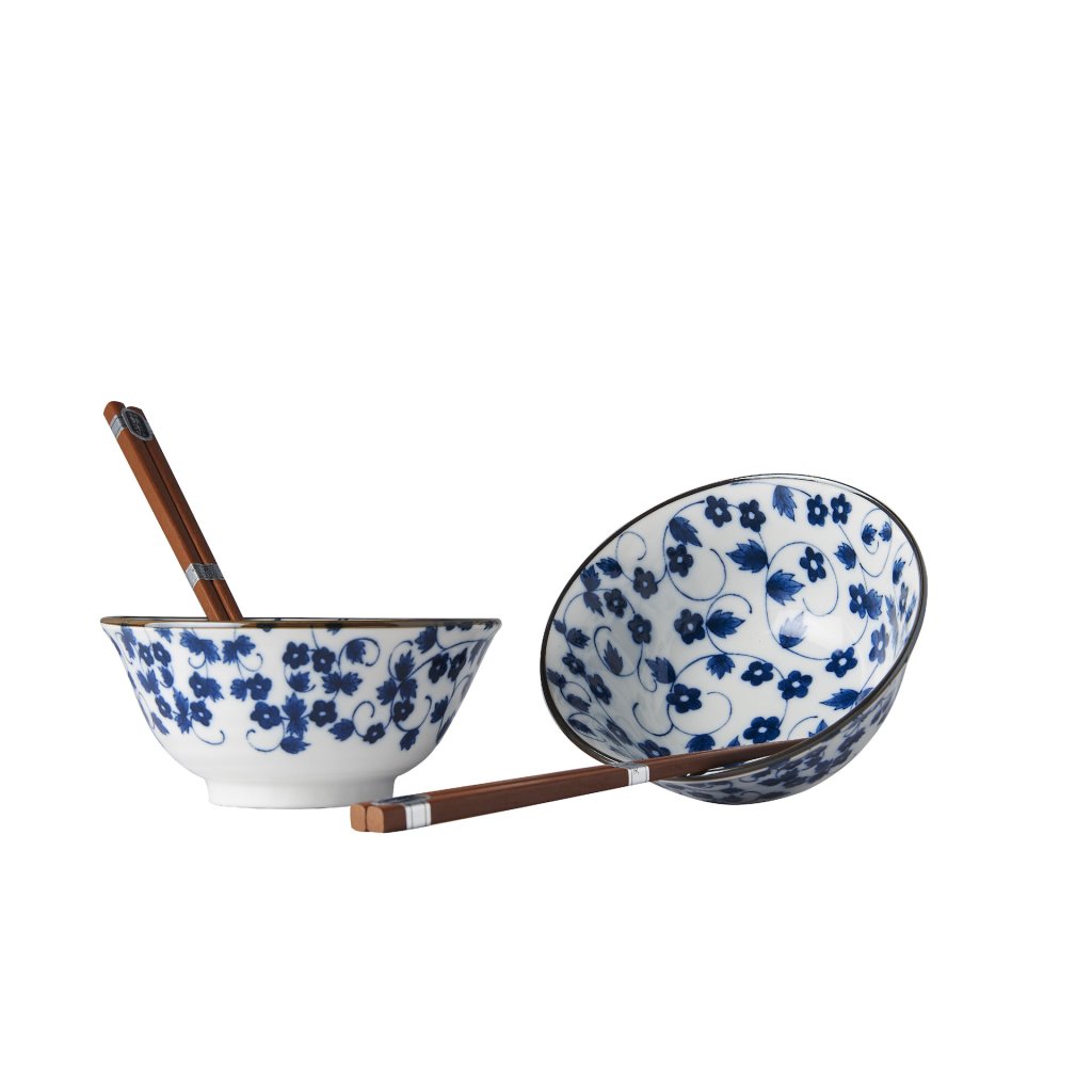 Komplekti kuulub 2 paari puidust söögipulki ja 2 valgeid, käsitsi maalitud siniste lilledega kausi. See komplekt on elegantses mustas kinkekarbis ja sobib seega kingituseks sõpradele või äripartneritele.