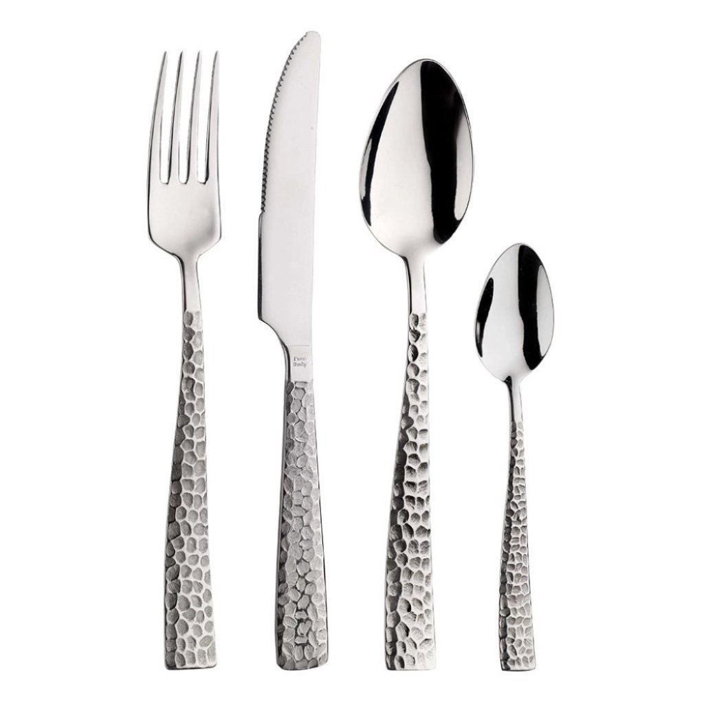 - söögiriistade läikivad pinnad on kontrastis matt haamrilõikega osadega ja loovad ainulaadse visuaalse efekti