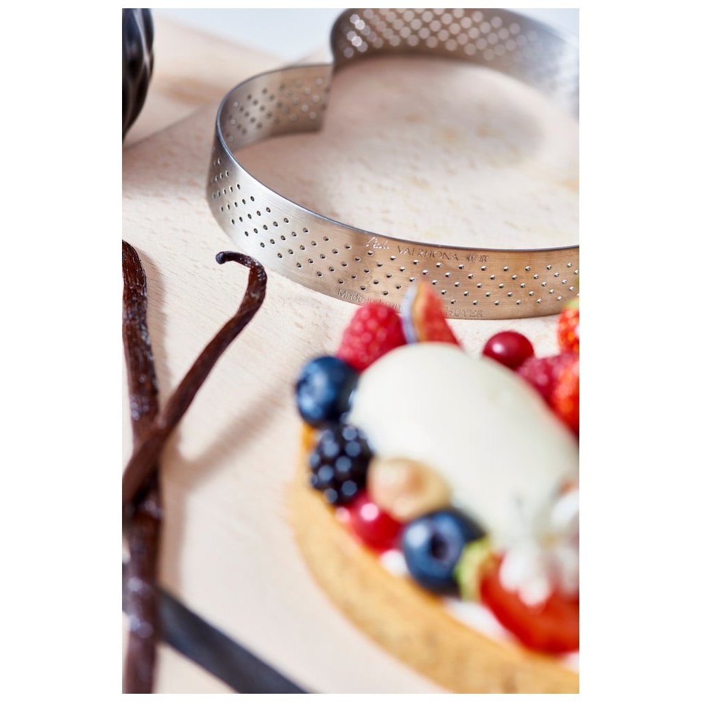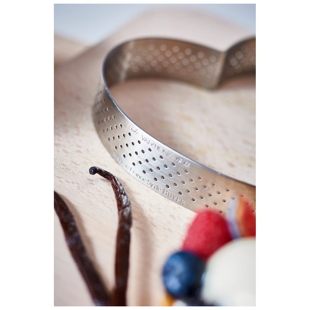 Perforeeritud südamega küpsetusvorm de Buyer sobib ideaalselt erinevate magustoitude ja kookide, leht- ja koogikoogi valmistamiseks. Aukud vormi küljes aitavad koogi servadel ühtlaselt küpseda. Koostöös Ecole du Grand Chocolat Valrhona'ga välja töötatud vorm on valmistatud vedrustatud roostevabast terasest ja sellel on sirge serv, mis tagab veatu lõppviimistluse. See ei ole keevitatud ja naaseb alati oma algsesse vormi, kui see vabastatakse.