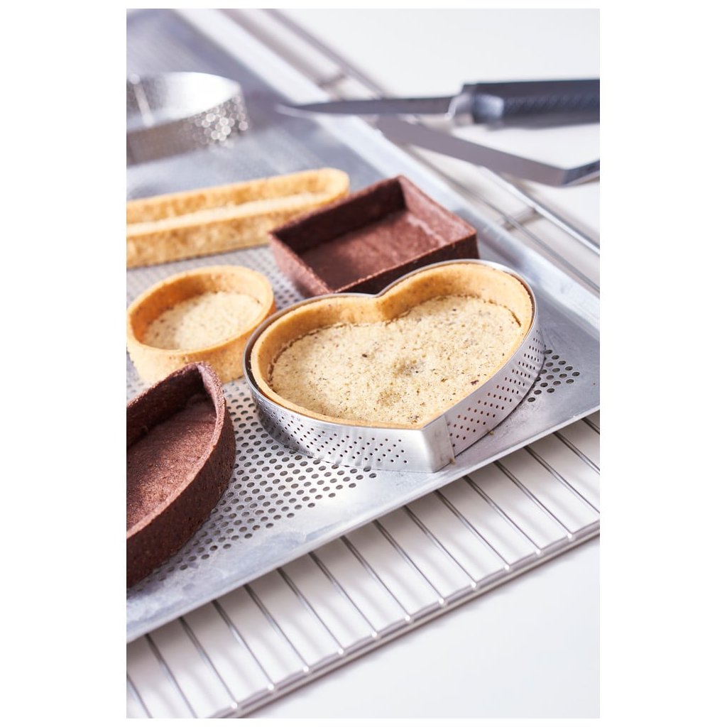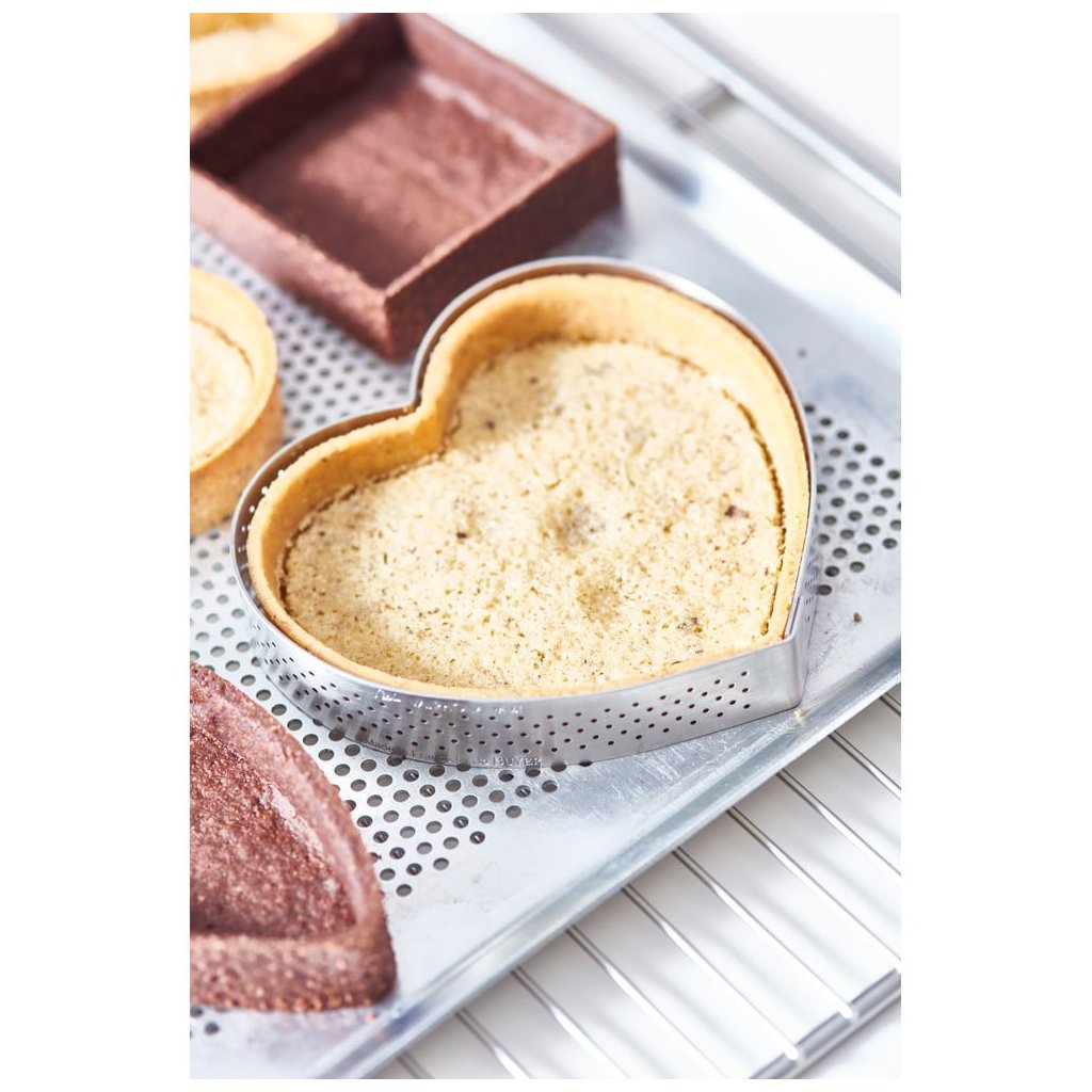 Perforeeritud südamega küpsetusvorm de Buyer sobib ideaalselt erinevate magustoitude ja kookide, leht- ja koogikoogi valmistamiseks. Aukud vormi küljes aitavad koogi servadel ühtlaselt küpseda. Koostöös Ecole du Grand Chocolat Valrhona'ga välja töötatud vorm on valmistatud vedrustatud roostevabast terasest ja sellel on sirge serv, mis tagab veatu lõppviimistluse. See ei ole keevitatud ja naaseb alati oma algsesse vormi, kui see vabastatakse.