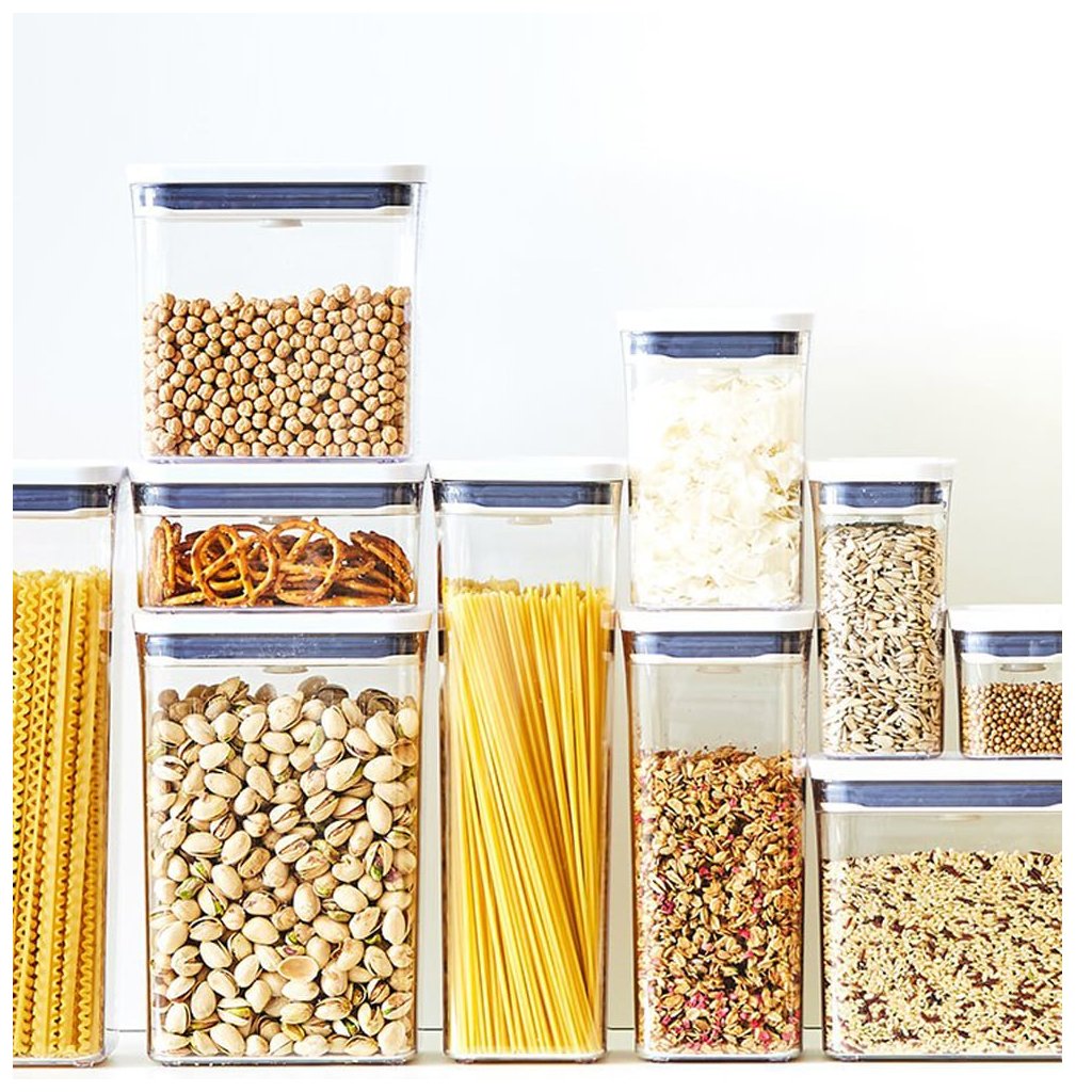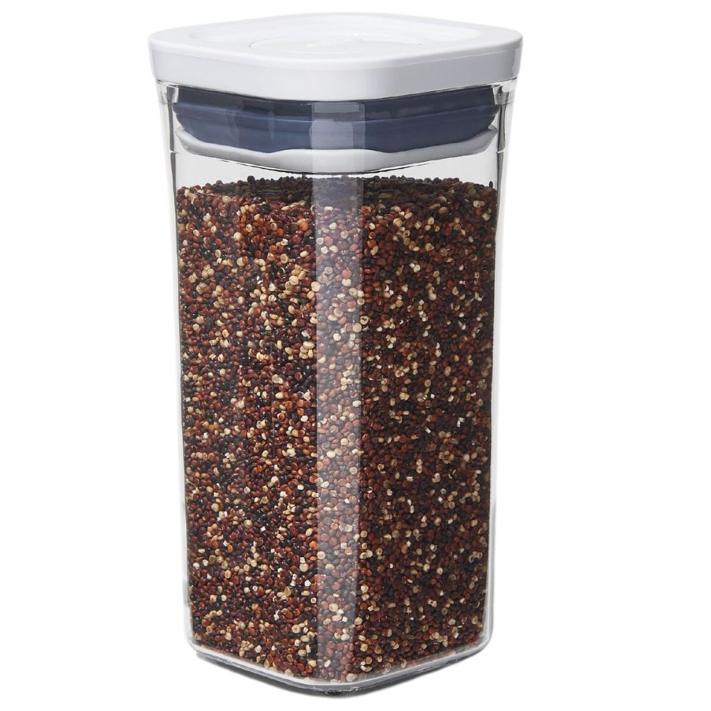- õhukindel mahuti kuivtoiduainete - teravilja, küpsiste, müsli, kinoa, pähklite, teravilja, kohvi, vürtside, jahu, suhkru ja muu - säilitamiseks